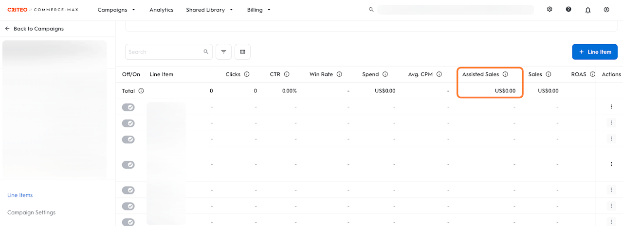 Assisted sales represent the number of purchases a line item helped influence, through impressions or clicks, but did not receive attribution credit for. The credit was assigned to a different line item.