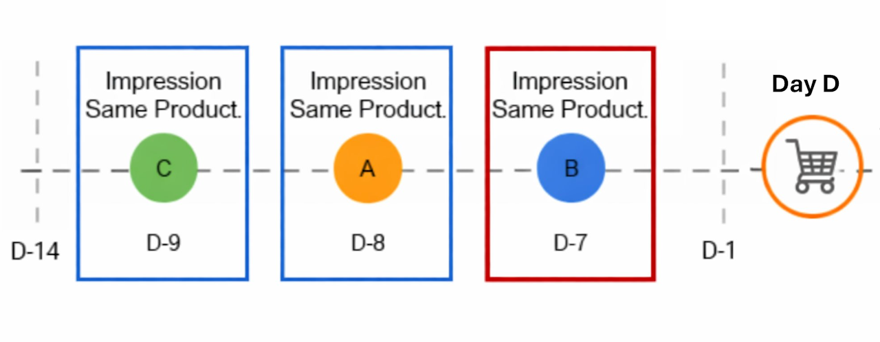 A shopper is exposed to A (impression), C (impression), and then B (click) before purchasing a product, eligible for attribution to the 3 line items (according to their attribution settings).