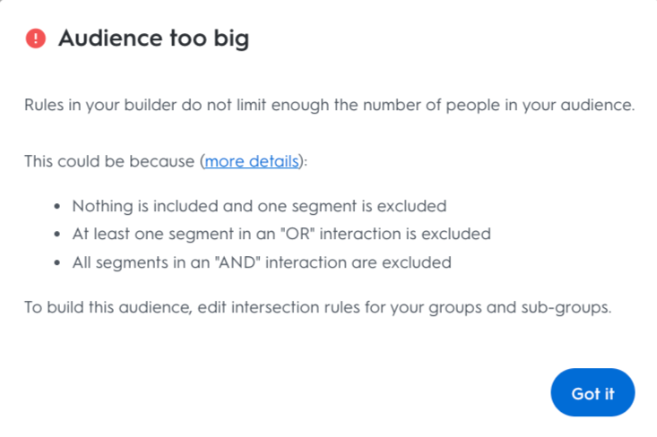 You might see this error message while building your audience indicating that your audience size is too big because the rules in your Audience Builder do not sufficiently limit the number of people in your audience.