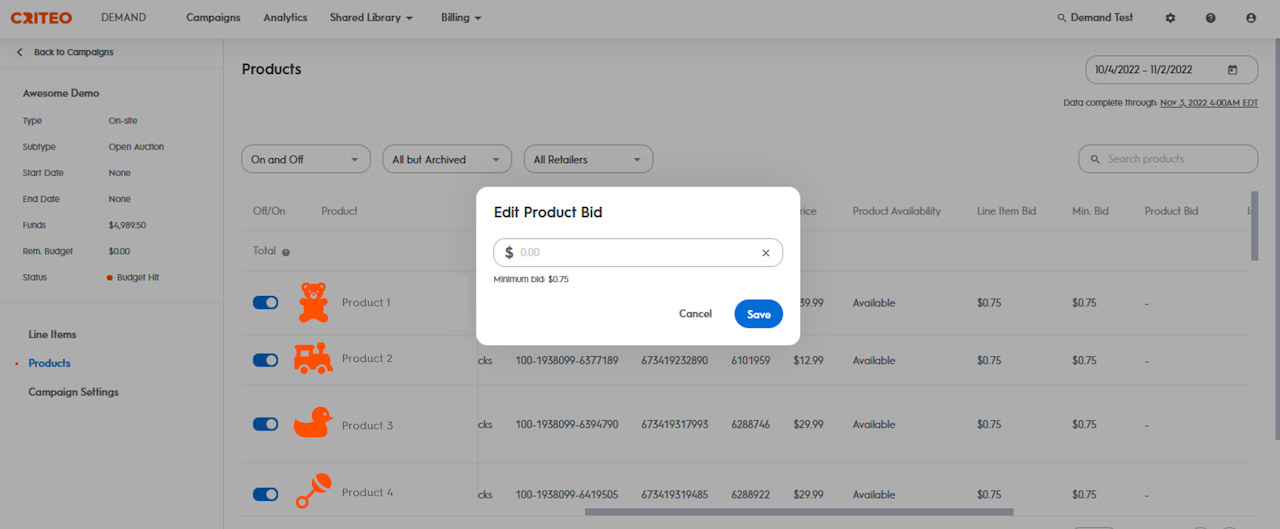 You will see all products featured under the campaign, across all its line items. If you scroll to the right in this table, you will see the same Product Bid column and can also set product bid overrides here.