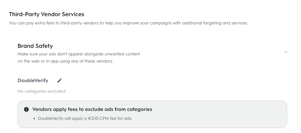 Select specific brand safety categories you would like to exclude through DoubleVerify. Here you will be able to add categories to exclude from the list provided. Once selected to exclude, the line item will never appear alongside any content in those categories. This section serves as an extra measure of precaution in addition to the Domain and App Bundle blocklists.