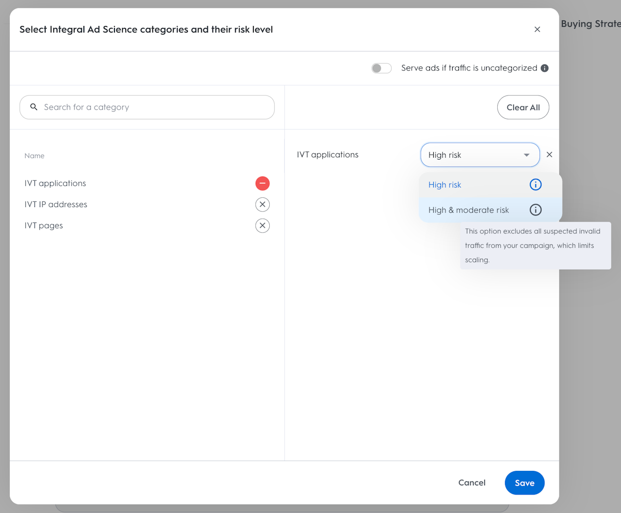 Exclude High Risk Suspicious Activity: This removes the majority of invalid traffic pages and applications from your campaign, but allows you to scale more easily.