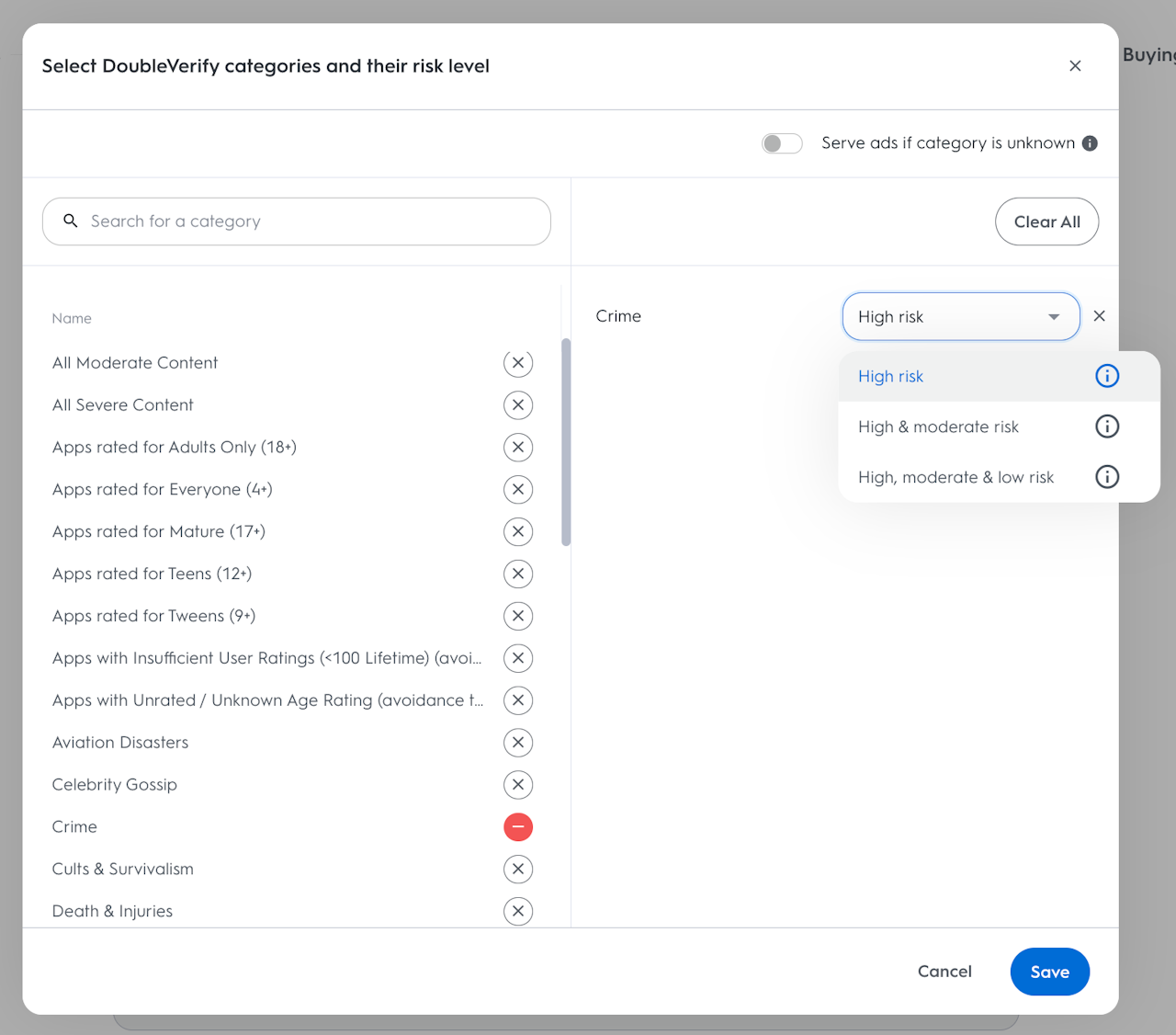 The targeting of DoubleVerify segments allows the exclusion of various brand safety categories and defines levels of risk – “High”, “High and Moderate”, and “High, moderate, and low risk”.