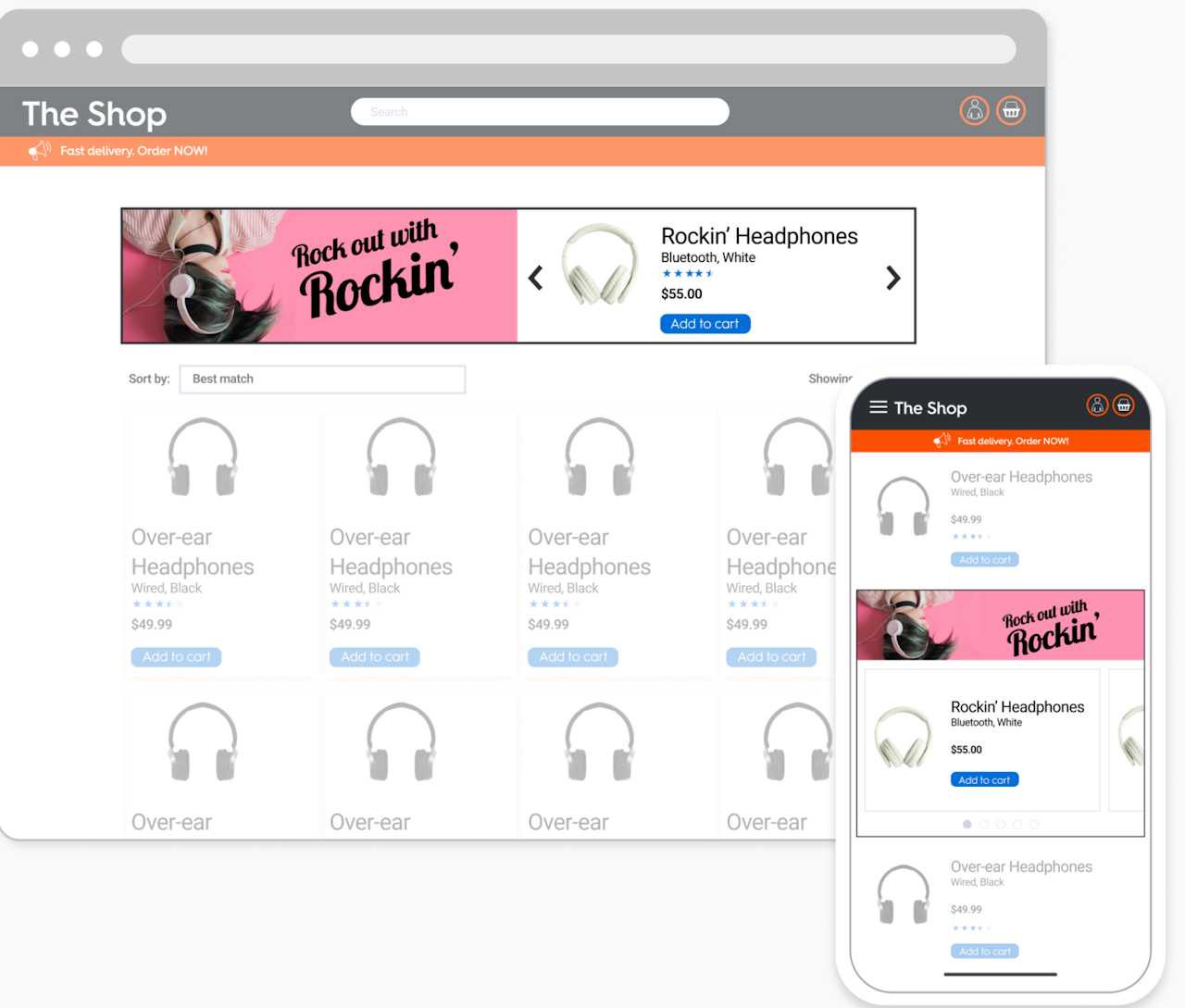 Flagship is a horizontal Commerce Display unit that consists of a branding zone and a product zone with a carousel of up to 5 SKUs.