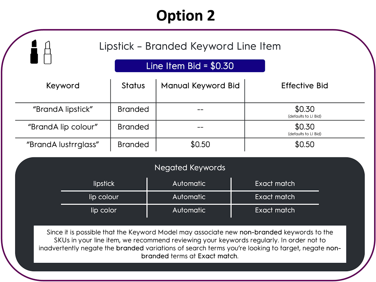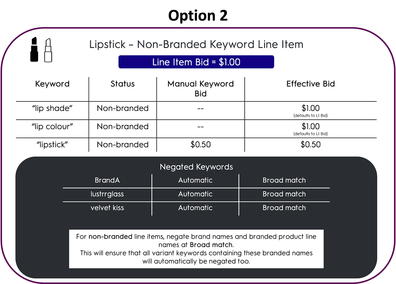 We recommend choosing your setup based on your reporting requirements and whether you will frequently need to adjust bids holistically for all branded keywords or all non-branded keywords at once. If this is the case, option 2 may be preferred.