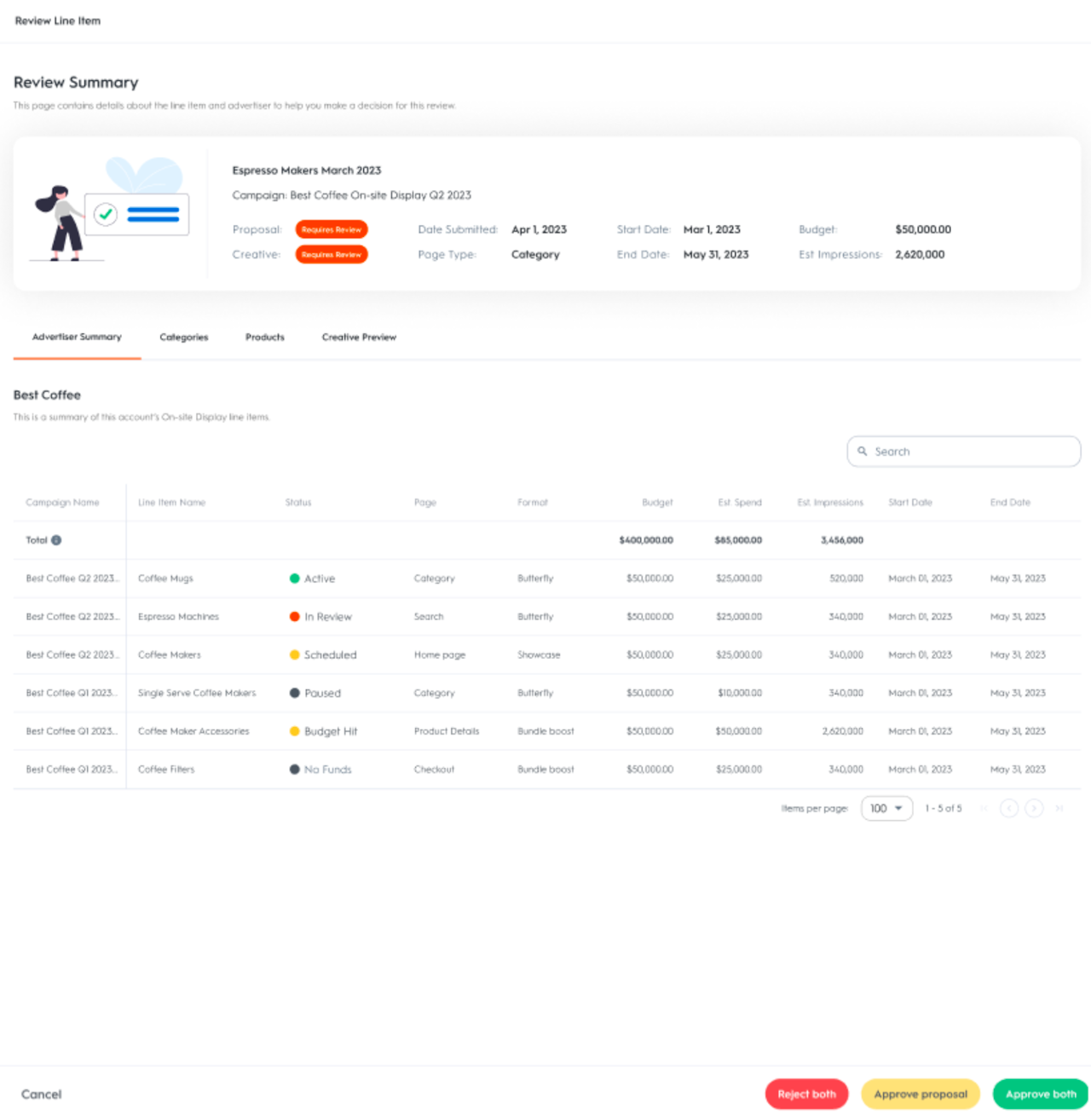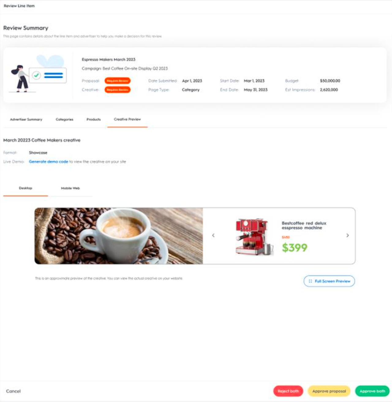 Approve both: Click to approve both the proposal and the creative, with the option to leave an optional comment for the advertiser. An approved proposal reserves inventory for the advertiser, fulfilling the line item's proposal details.