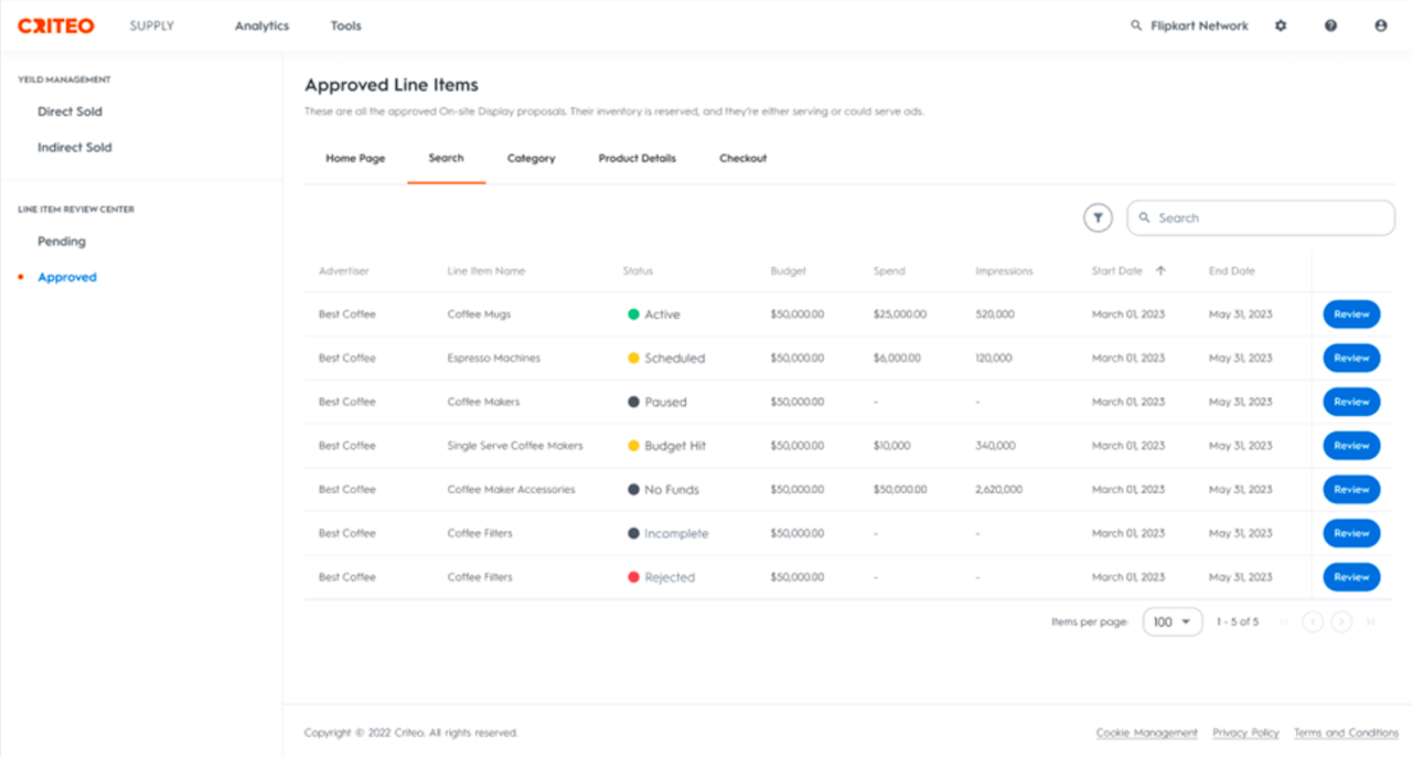 View all Onsite Display line items with a submitted proposal and/or creative here. These line items require your review. The table lists the status of each proposal and creative and displays what action needs to be taken. Click Review next to the line item you want to review.