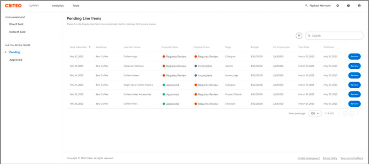 The review process allows for the independent approval of proposals and later review of creatives following their submission. This process allows advertisers to reserve inventory in advance by submitting proposals, commonly done before submitting the creative.
