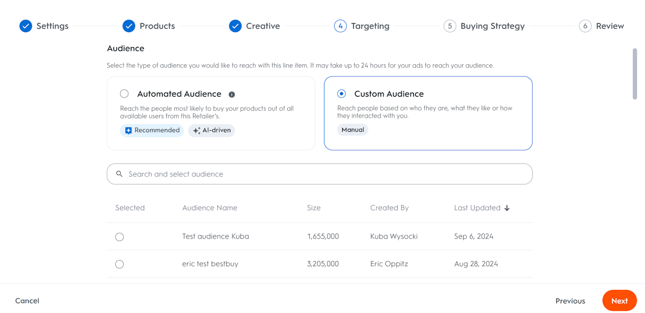 In the Targeting step of setting up/ editing a line item, you’ll have the option to select the type of audience you would like to reach. Your options will be an Automated audience or a Custom audience.