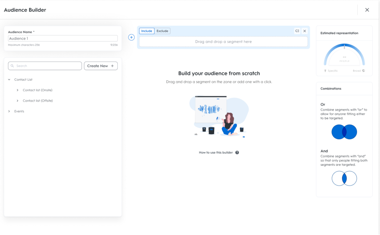 And, our Audience Builder allows you to combine these Event Segments and Contact List Segments to create an audience segment that you can target in your Onsite Display campaigns.