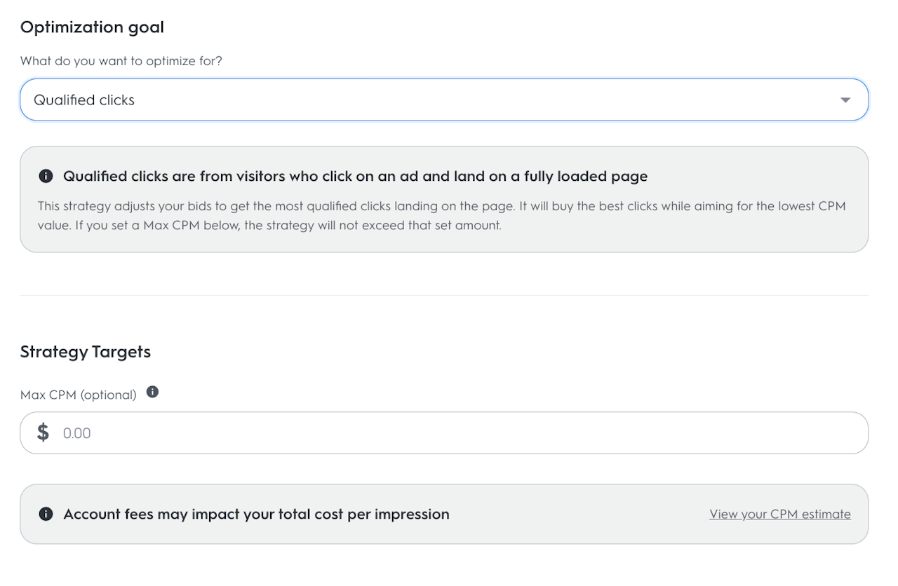 It adjusts your bids to get the most qualified clicks landing on the page. It will buy the best clicks while aiming for the lowest CPM value. If you set a Max CPM below, the strategy will not exceed that set amount.