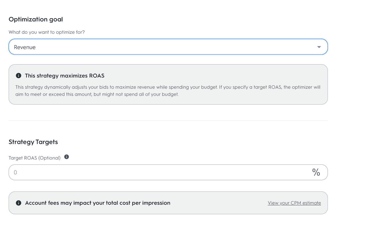 You can set a target ROAS, which is an optional input recommended only when reaching the specific target ROAS is specifically requested, as it may restrict budget delivery.