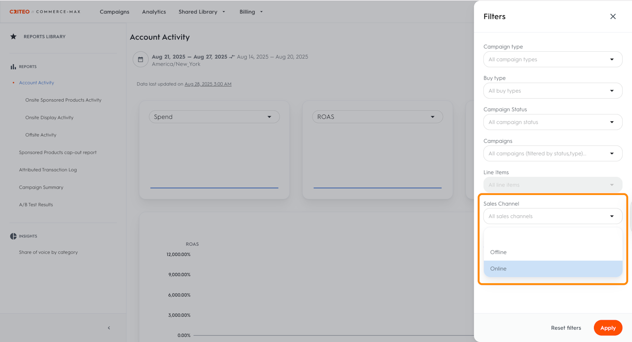 The Sales Channel filter will filter the sales in your report, but not all retailers provide offline sales data.