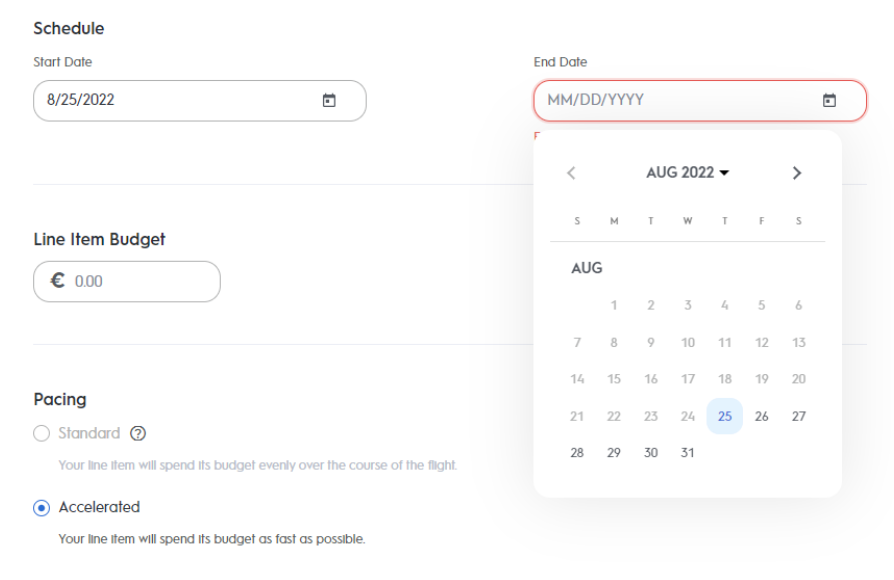 Then continue by selecting an end date directly on the calendar. Your line item will stop serving ads and change to Ended status on this precise date at the end of the day.