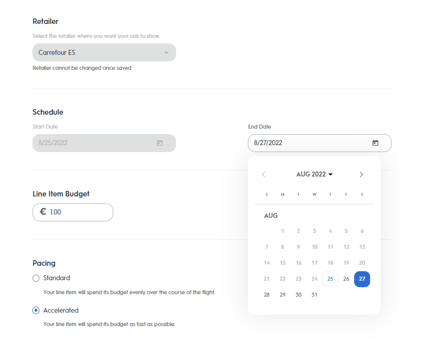 If you need to select another start date, we recommend that you set up a new line item with the new start date, retailer and product(s).