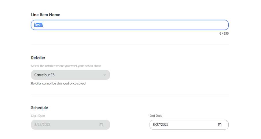 In the Retailer section, you can see the previously selected retailer in the dropdown, but you cannot edit the retailer selected for a line item after creating the line item.