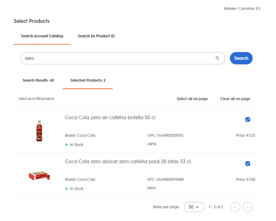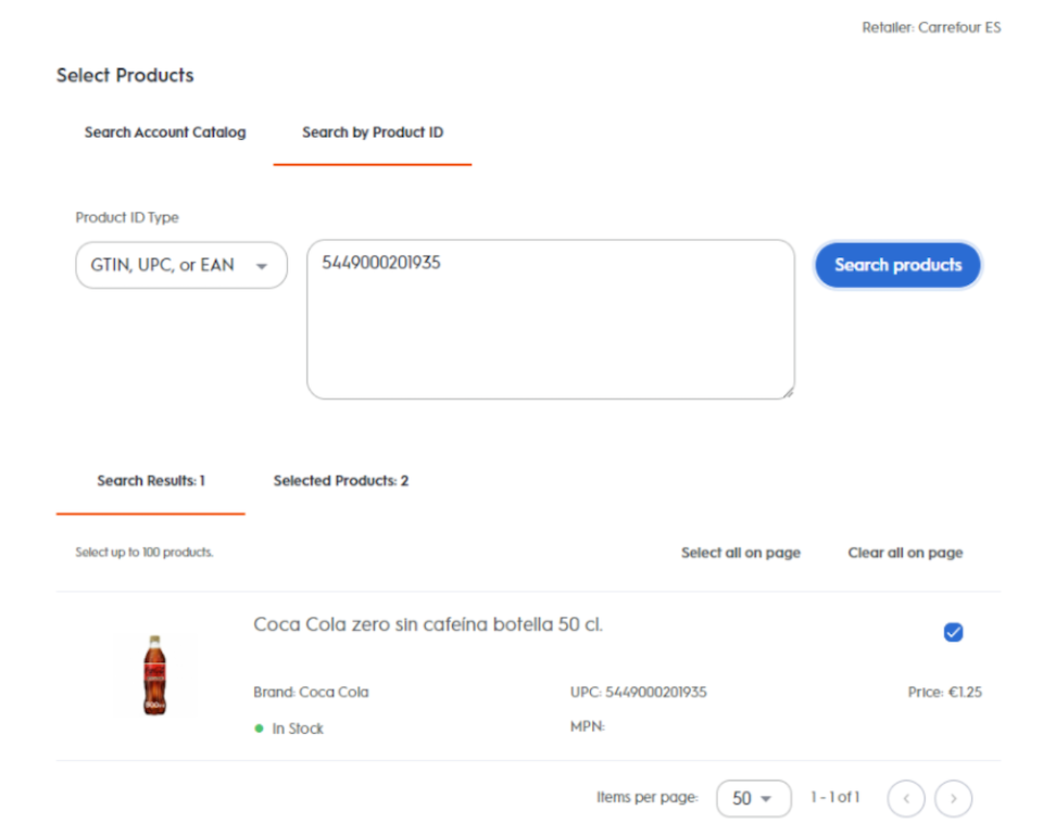 By default, the Search Results table returns the first 50 products that match the search query. To see more results, either increase the number of products per page via the dropdown on the right-hand corner or navigate to the next page using the arrow on the bottom right-hand side.