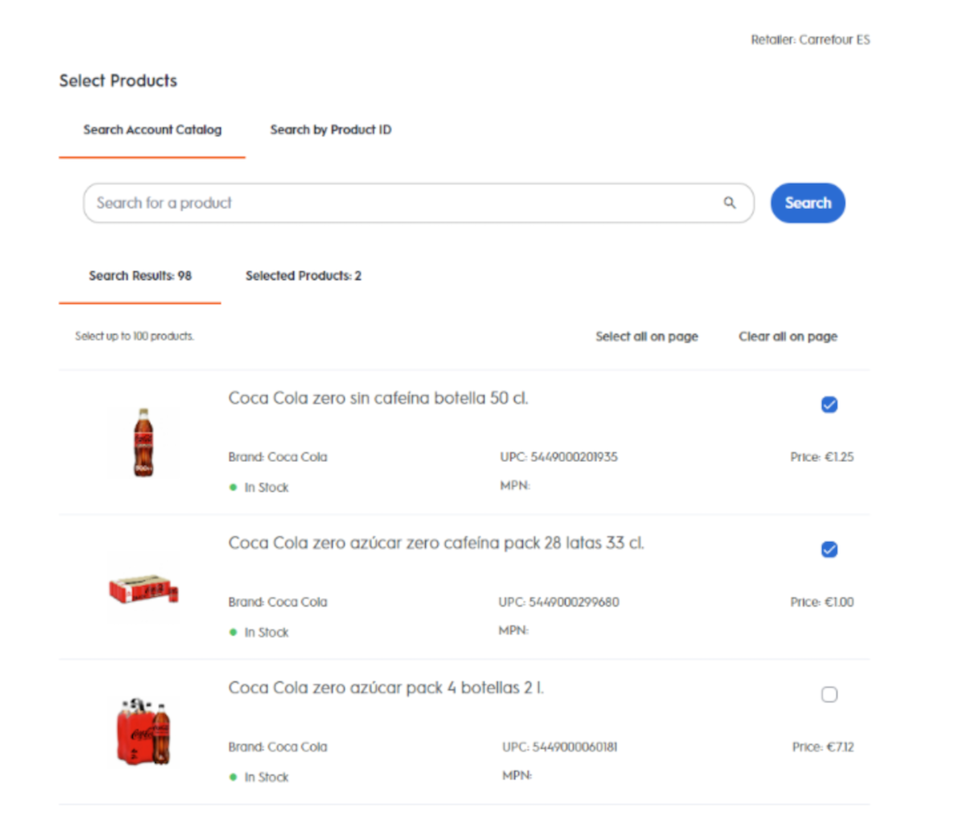 To select all matched products, click Select All on Page button on the top right-hand side