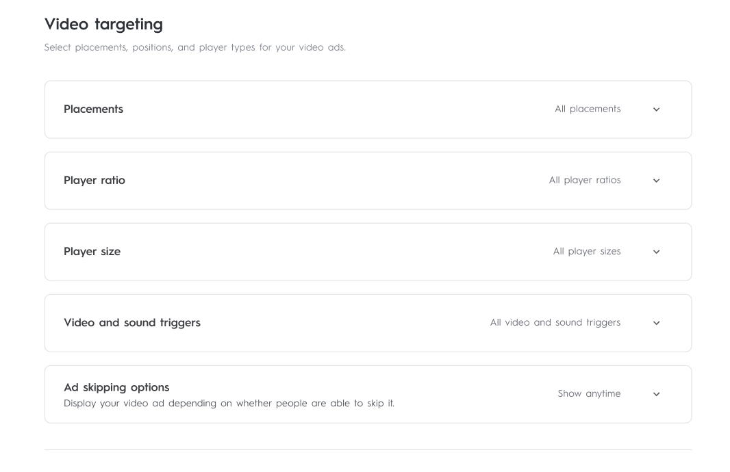 If the video creative type was selected in the creative step of the line item setup, you will see additional video-specific targeting capabilities. These settings will only apply to video creatives.
