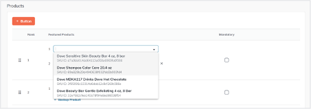 To modify a featured product, click the dropdown menu, delete any input in the text field to retrieve the full list of products, and select a new product to display within the ad.