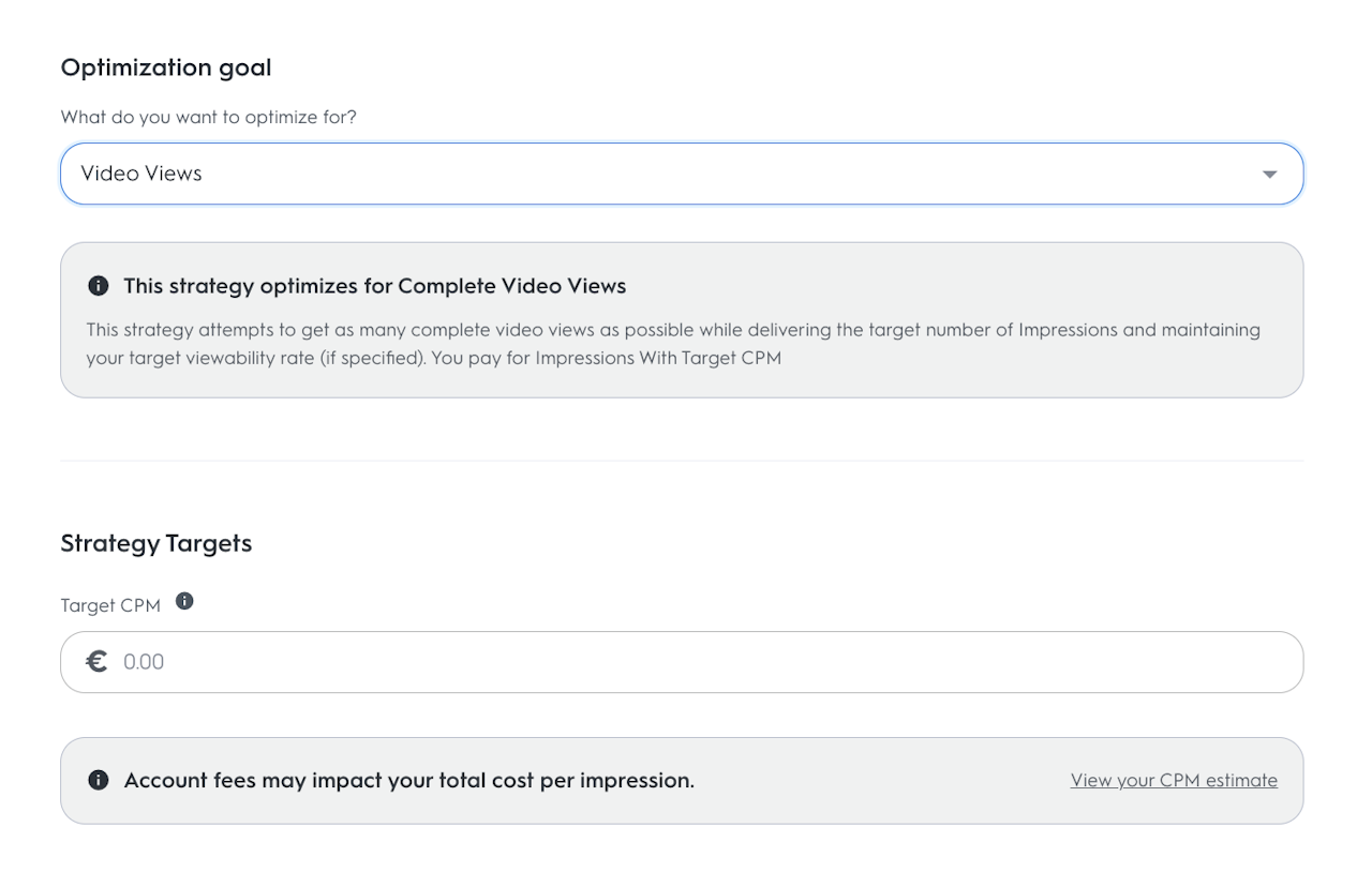Optimize for Complete Video Views (Video only): This strategy will buy as many completed views as possible while delivering your line item budget. You pay for impressions with a Max CPM (optional). The strategy will aim to buy as many impressions as possible always respecting the specified maximal CPM, if specified.