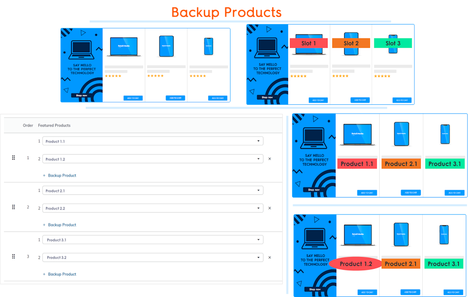 Product 1.1 is now out of stock. Thanks to the backup product that the user set up, the Showcase will keep serving with Product 1.2 in slot 1 until Product 1.1 is back in stock. Product 2.1 will still serve in slot 2, and Product 3.1 in slot 3.