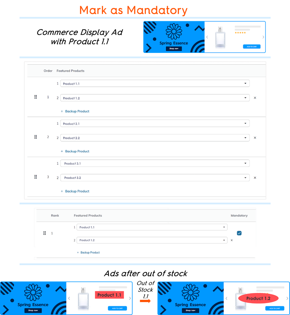 The user marks the Product Listing 1 as mandatory because they don’t want the ad to show if Product 1.1 or Product 1.2 are out of stock.