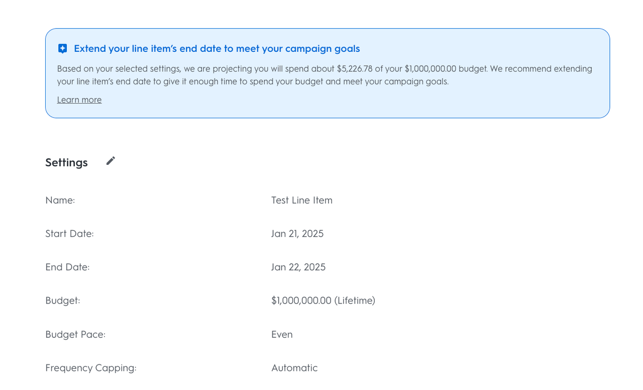 After clicking Launch, you will be brought back to the Line Item Dashboard for the campaign your line item lives within. At this point, you can view your line item by clicking its name on the Campaigns page. You can view, edit, and manage any of your line items on the resulting line items page.
